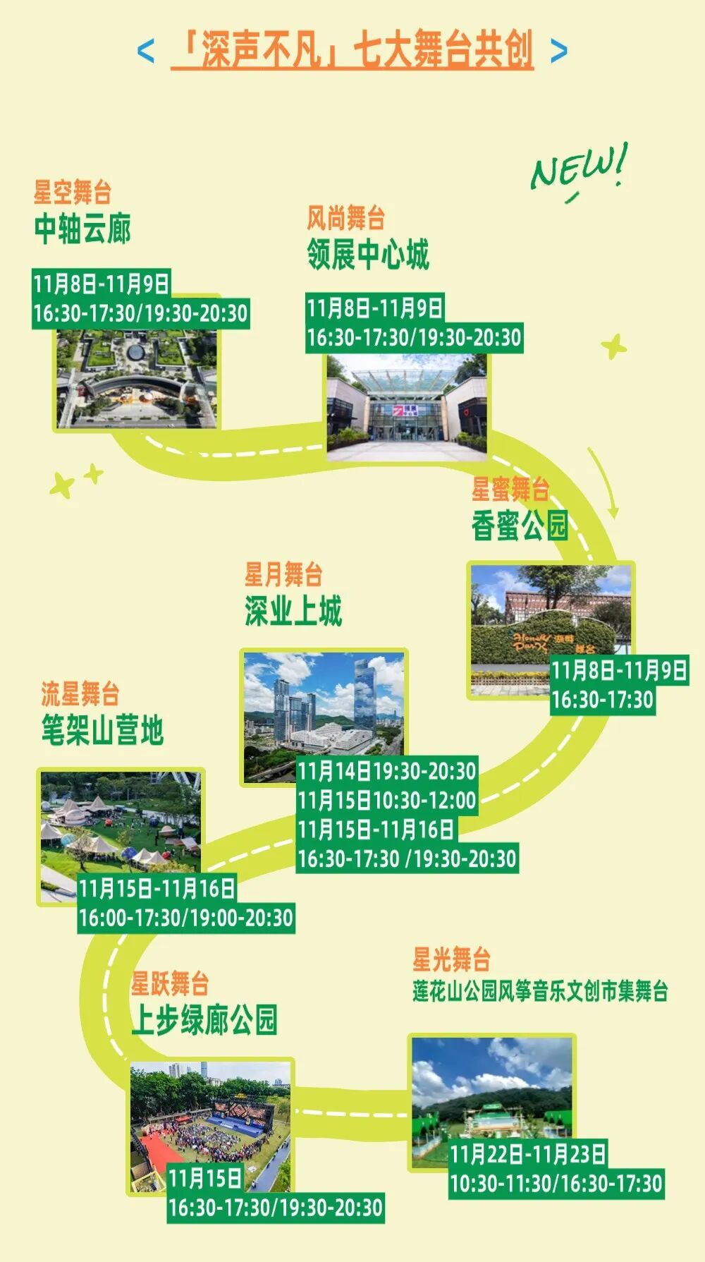 自11月8日起,中轴云廊的星空舞台、领展中心城的风尚舞台、香蜜公园的星蜜舞台、深业上城的星月舞台、笔架山营地的流星舞台、上步绿廊公园的星跃舞台,以及莲花山公园星光舞台将陆续开演,让音乐深深融入城市肌理,让深圳这座“爱乐之城”的旋律“走出殿堂、响彻全城”。