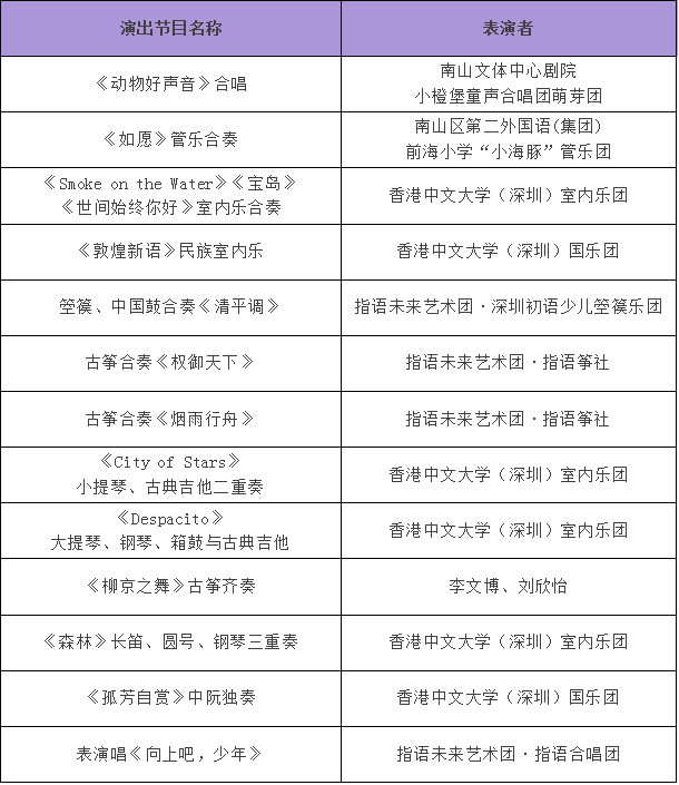 在社会团体招募参与方面,本次音乐会共收到涵盖古典乐、民乐、合唱的32份正式报名资料,经过层层选拔,香港中文大学(深圳)室内乐团、指语未来艺术团·深圳初语少儿箜篌乐团等乐团脱颖而出。其中,在11月15日10:30~12:00的深业上城·星月舞台,将举办线上招募团队专场表演。